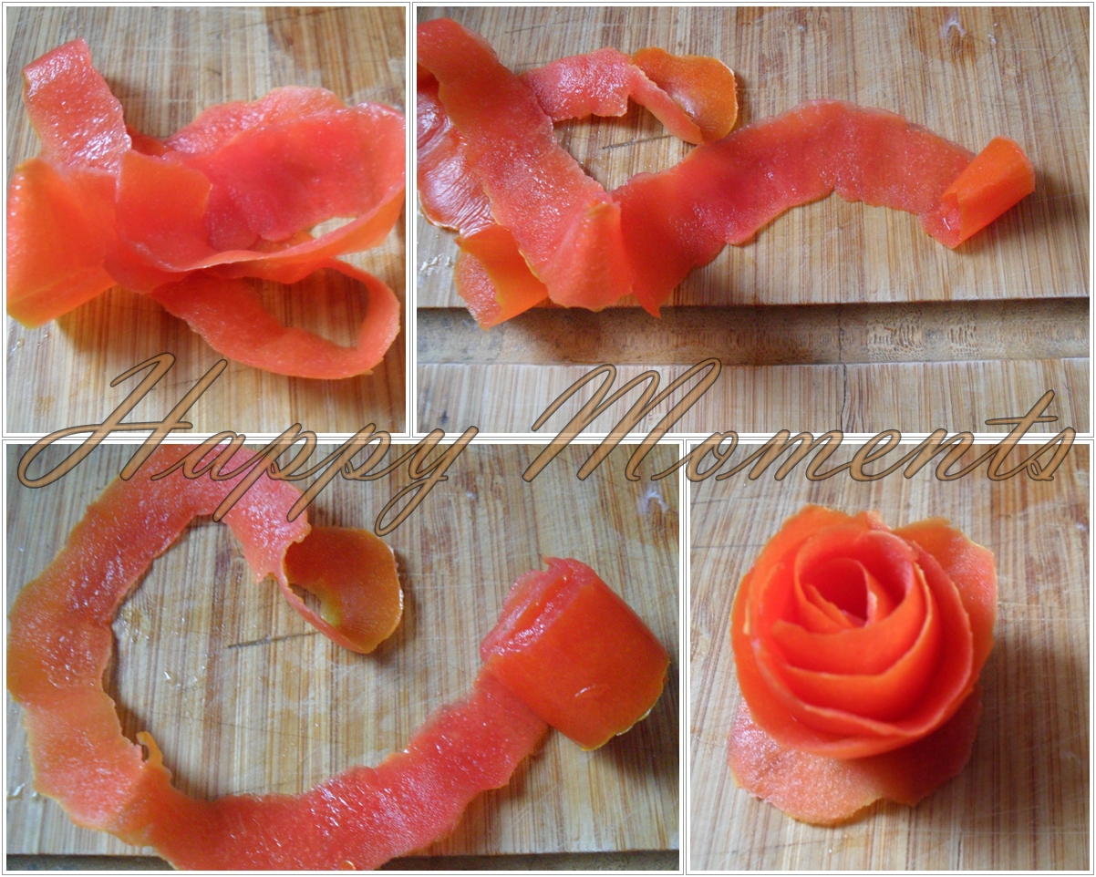 Ezt a rózsát például meghámozott paradicsom héjból lehet elkészíteni nagyon egyszerűen, bár nekem nem mindig sikerül szépen megcsinálni.
